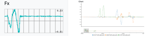 Die folgenden zwei Grafiken zeigen Beispiele für mögliche Datenvisualisierungen in der Web-Oberfläche. Die linke Grafik stellt live die Kräfte der x-Achse dar, während in der rechten Grafik die historischen Daten verschiedener Kräfte des Roboters visualisiert werden. Darüber hinaus wurden verschiedene Analysemethoden implementiert, um z.B. Minima und Maxima zu ermitteln.