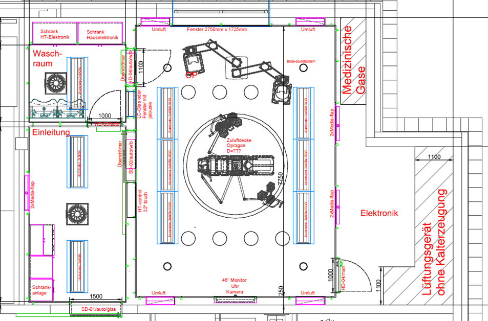 Im vollständig eingerichteten Lehr- und Forschungs-OP werden neue und bestehende OP-Technologie, Medizin-, Haus- und Gebäudetechnik im Sinne eines effizienten und sicheren Systems getestet, weiterentwickelt, demonstriert und geschult. Ein komplettes System kann in verschiedenen Funktionszuständen erklärt und trainiert werden. Forschung und Entwicklung neuer Produkte und die Simulation und Optimierung von Arbeitsprozessen sind möglich.