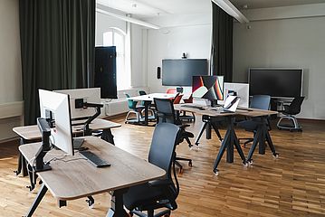 The Learning Hall was designed as an innovative space for individual learning and working with digital media. At the heart of the concept are high-performance workstations that are independent of the wired power and LAN supply. Powerful MacBook Pro computers are used for this purpose, supplemented by an external monitor, keyboard and mouse. These are each integrated into a modern, mobile, height-adjustable, battery-powered workstation. The battery capacity is designed for a busy working day. However, should it not be enough, you simply replace the battery and continue your work. Of course, you can also use your own devices and use them as an alternative to the MacBook at the battery-powered workstation. Or you can use one of the individual workstations or the seminar chairs. If the screens are too small for you, or if you need a really large screen for group work, you can use the screens on the walls. Just like in a digital classroom, simply connect them via cynaps. Part of the room can be separated from the rest of the room with a soundproof curtain. This "virtual collaboration space" is intended for meetings and group work.