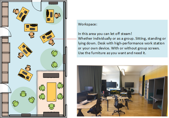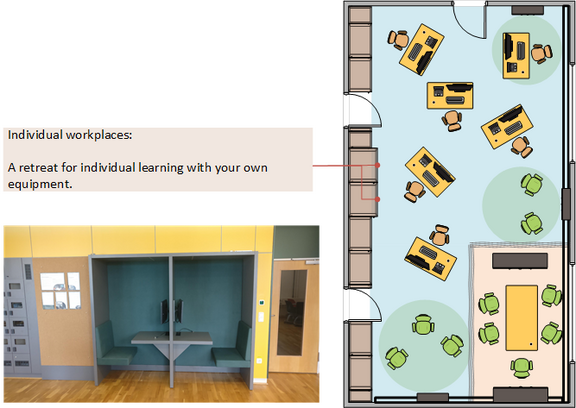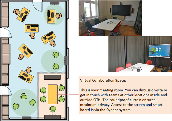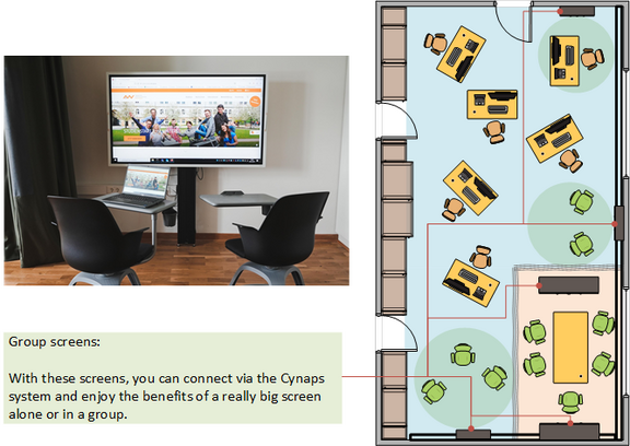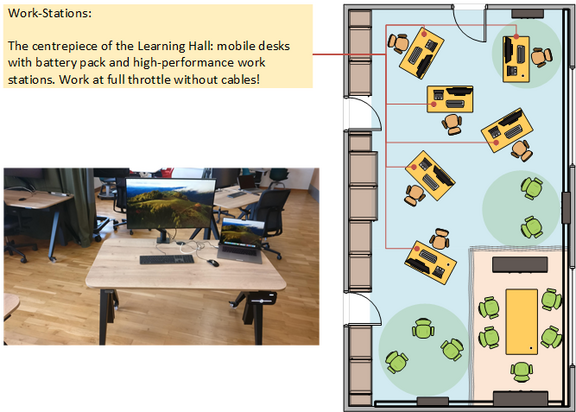 The Learning Hall was designed as an innovative space for individual learning and working with digital media. At the heart of the concept are high-performance workstations that are independent of the wired power and LAN supply. Powerful MacBook Pro computers are used for this purpose, supplemented by an external monitor, keyboard and mouse. These are each integrated into a modern, mobile, height-adjustable, battery-powered workstation. The battery capacity is designed for a busy working day. However, should it not be enough, you simply replace the battery and continue your work. Of course, you can also use your own devices and use them as an alternative to the MacBook at the battery-powered workstation. Or you can use one of the individual workstations or the seminar chairs. If the screens are too small for you, or if you need a really large screen for group work, you can use the screens on the walls. Just like in a digital classroom, simply connect them via cynaps. Part of the room can be separated from the rest of the room with a soundproof curtain. This "virtual collaboration space" is intended for meetings and group work.