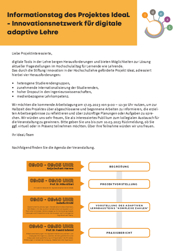 We would like to draw your attention to an information event about our third-party funded project "IdeaL - Innovation Network for Digital Adaptive Teaching" (https://oth-aw.de/ideal) and at the same time cordially invite you to attend.