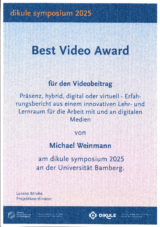 43 contributions, selected from over 130 submissions, were presented at the symposium and invited discussion. The contribution from OTH Amberg-Weiden entitled „Präsenz, hybrid, digital oder virtuell – Erfahrungsbericht aus einem innovativen Lehr- und Lernraum für die Arbeit mit und an digitalen Medien“ was able to hold its own against strong competition and was honoured with the ‘Best Video Award’. All conference participants were eligible to vote for the award and were impressed by the topic, content and quality of the contribution.