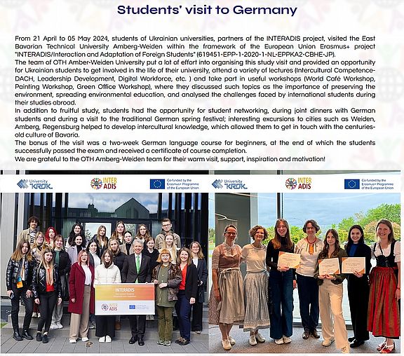 Ostbayerische Technische Hochschule OTH Amberg-Weiden is part of the Erasmus KA2 project "Interadis" (International Students Adaptation and Integration) - together with eight Ukrainian universities as well as an Italian, a Lithuanian and a Dutch university. The cooperation is supervised by the KOMO (Competence Centre Bavaria - Central and Eastern Europe) of the OTH Amberg-Weiden in collaboration with the International Office.