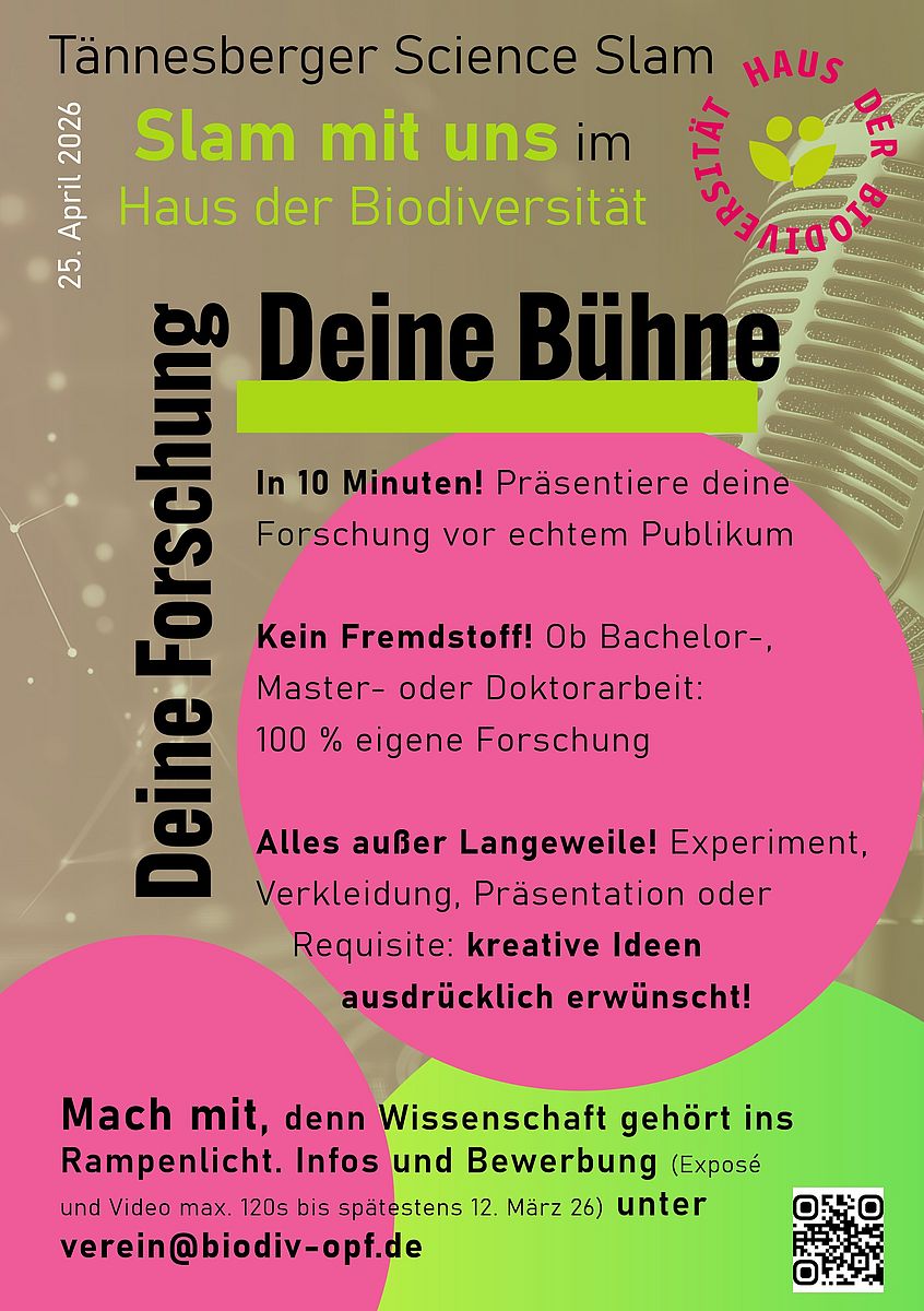 Beim Science Slam im Haus der Biodiversität Tännesberg bringen junge Forschende ihre spannendsten Ideen rund um Natur, Nachhaltigkeit und die Vielfalt des Lebens mit Witz, Leidenschaft und Bühnen-Power auf den Punkt…