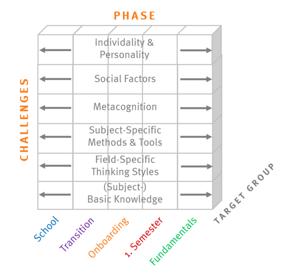 While settling in at the university students are typically confronted with a variety of complex topics. The interaction of the various factors is very individual. To keep an overview of this and corresponding support services or the need for such, we categorise challenges and potentials in six key areas and relate them to the phases of the student-life-cycles that are particularly relevant for us.