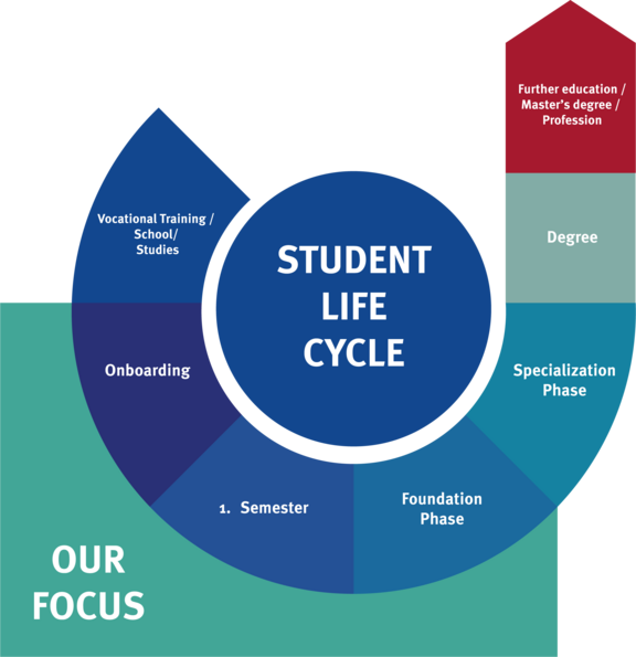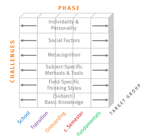 While settling in at the university students are typically confronted with a variety of complex topics. The interaction of the various factors is very individual. To keep an overview of this and corresponding support services or the need for such, we categorise challenges and potentials in six key areas and relate them to the phases of the student-life-cycles that are particularly relevant for us.