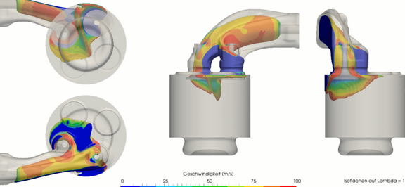 CFD-Simulationen ermöglicht die ressourceneffiziente Untersuchung Neuer Kraftstoffe. Die Strömungsführung sowie die Verbrennung der Kraftstoffe kann dadurch simuliert, modellhaft abgebildet und optimiert werden. Dies führt zu Effizienzsteigerung und zu einer besseren Kraftstoffausnutzung. in den Abbildungen ist die Strömungsführung bei einem Gasmotor im Wasserstoff-Betrieb zu sehen. Durch die Strömungs-Optimierung im Rahmen des hierfür generierten Modells konnte die maximale Leistung des Motors im reinen Wasserstoffbetrieb um 20% gesteigert werden.