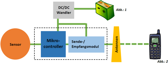 verarbeitet und über das GSM-Netz versendet werden. Optional sollen dabei auch die Lagedaten des Fahrzeuges über GPS erfasst und verschickt werden können. Die Abfrage des Kilometerstandes bzw. der Lagedaten sollte über eine SMS an das „Fahrzeug“ ermöglicht werden. Mithilfe der folgenden Darstellung soll kurz der schematische Aufbau der einzelnen Bauteile erläutert werden:
