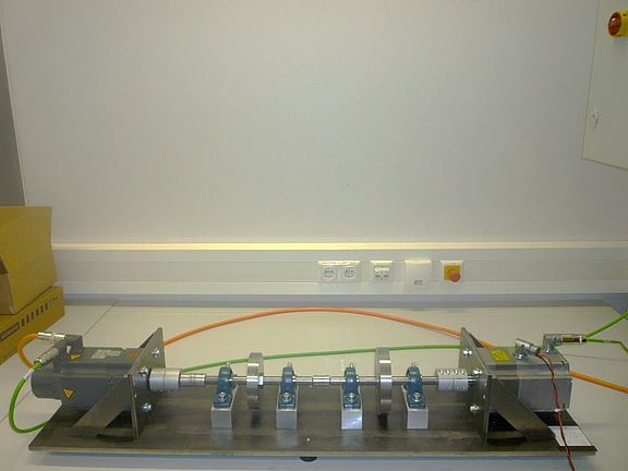 Innerhalb einer Projektarbeit wurde von drei Maschinenbaustudenten ein Dreimassenschwinger konstruiert und in Zusammenarbeit mit der Zentralwerkstatt der Hochschule praktisch aufgebaut. Der Teststand besteht aus zwei Synchronservomotoren und zwei Drehmassen, die über elastische Kupplungen miteinander verbunden sind.