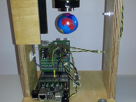 Ein interessantes mechatronisches Praxisbeispiel bildet der Teststand „Schwebende Kugel“, der innerhalb einer Projektarbeit entwickelt wurde. Die Problemstellung besteht darin, eine metallische Kugel mit Hilfe des Magnetfelds einer darüber positionierten Spule in der Schwebe zu halten. Da es sich hierbei jedoch um ein instabiles System handelt, ist die Aufgabenstellung nicht ganz trivial. Dies liegt daran, dass die magnetische Kraft mit zunehmender Entfernung der Kugel zum Magneten absinkt. Durch einfaches Anlegen eines konstanten Stroms an die Spule ist daher kein stabiler Betriebspunkt zu erreichen.