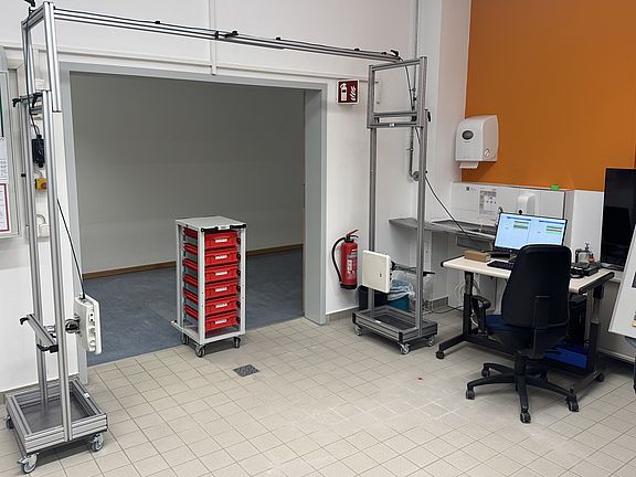 Eine besondere Herausforderung bei der Verbindung der drei Labore mit Hilfe von Autonomen Transportfahrzeugen waren die beengten Platzverhältnisse im Verbindungsflur: die lichte Flurbreite beträgt nur 2,70 m, was Kurvenfahrten und insbesondere die 180°-Wende erschwert. Nach ersten Tests mit Transportwägen der Abmessungen 600 x 800 mm war klar, dass kleinere Transportwägen erforderlich sind - was aber im Hinblick auf die zu transportierenden, eher kleinen Teile & Produkte kein Problem darstellt. Nach einer intensiven Marktrecherche schien ein Transportwagen BTW 43 von GRUBER systeme (Holzkirchen) mit 6 Eurobehältern 400 x 300 x 120 mm hinsichtlich der Abmessungen sehr gut geeignet. Allerdings waren hinsichtlich der Eignung für das Greifen mit dem MiR-Hook und die geplanten Grundsatzversuche (u.a. bzgl. optimaler Position der Bock- und Lenkrollen im Hinblick auf Wendigkeit und Stabilität) einige Modifikationen erforderlich: