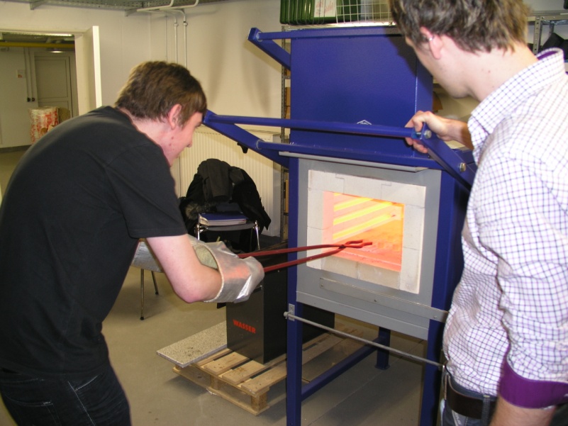 Probe 1 bleibt im Ausgangszustand (Referenzprobe), die Proben 2 bis 4 werden auf 900 °C durchgehend erwärmt. Probe 2 und 3 werden in Wasser abgeschreckt und Probe 3 anschließend bei ca. 400°C angelassen. Probe 4 wird an Luft langsam abgekühlt. An Hand des Eisen-Kohlenstoff-Diagramms bzw. der ZTU-Diagramme sollen die Studenten die Wärmebehandlungen beschreiben und Begriffe erläutern.