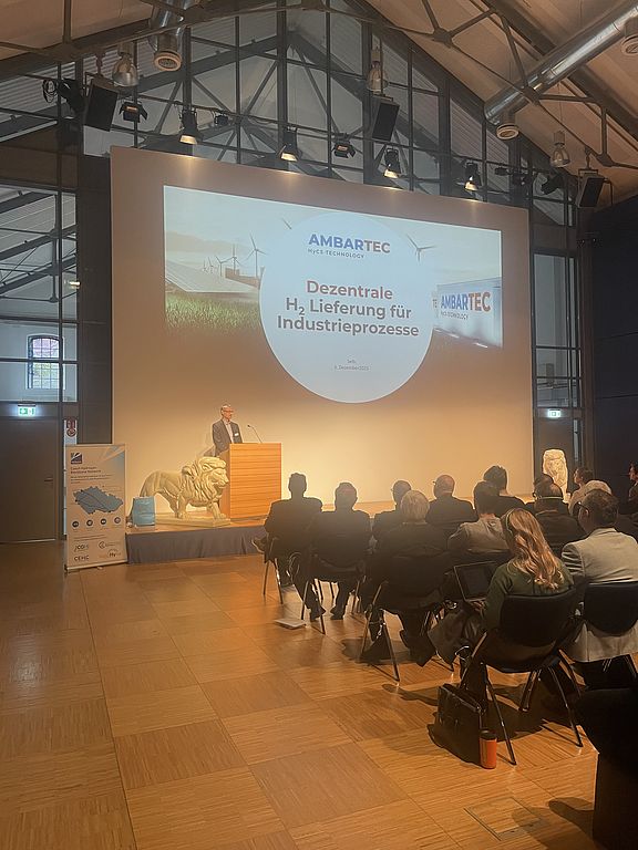 Mit innovativen Konzepten zur dezentralen Versorgung energieintensiver Industriebetriebe befasste sich Matthias Rudloff (AMBARtec AG). Er präsentierte Speichersysteme auf Basis von Eisenoxid, die bei niedrigem Druck betrieben werden können und perspektivisch kostengünstige Speichermöglichkeiten eröffnen.