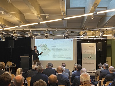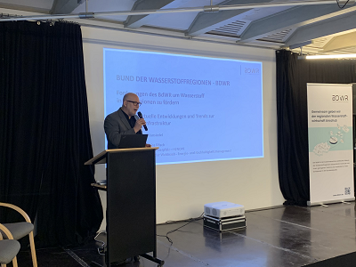 Im Anschluss folgte eine Reihe informativer Vorträge, die verschiedene Aspekte der Wasserstoffinfrastruktur beleuchteten. Matthias Rösch, Energie- und Nachhaltigkeitsmanager des Landkreises Neustadt an der Waldnaab, präsentierte die zentralen Forderungen des Bunds der Wasserstoffregionen. Sie wurde als gemeinsame Plattform der kommunalen Wasserstoffprojekte gegründet, um die Herausforderungen und Kompetenzen gebündelt auf bundespolitischer Ebene zu kommunizieren. Josef Rupprecht von der Bayernwerk Netz GmbH präsentierte Ansätze zur Anpassung des bestehenden Gasverteilnetzes an den Einsatz von Wasserstoff und zeigte dabei technische und regulatorische Herausforderungen auf, die für eine flächendeckende Integration überwunden werden müssen, insbesondere die Abnehmerstrukturen im Verteilnetz. Norbert Zösch vom Stadtwerk Haßfurt berichtete über Energiewendedienliche Elektrolyse in der Praxis. Dabei konnte er auf die erfolgreiche Umsetzung von Wasserstoffprojekten in Haßfurt hinweisen und hob die Bedeutung flexibler Lösungen in der kommunalen Umsetzung hervor.