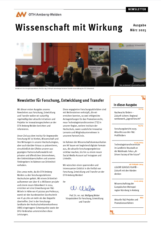 auch die dritte Ausgabe unseres Newsletters nach den ersten Wochen des Wintersemesters 2025/2026 widmet sich aus dem Institut für Angewandte Forschung (IAF) den aktuellsten Initiativen und Projekten aus Forschung, Entwicklung und Transfer an der OTH Amberg-Weiden. In beeindruckender Weise setzen wir den Erfolgsweg der F&E weiter fort, sei dies bei den eingeworbenen Drittmitteln, über Transferformate, in den Technologietransferzentren oder über die Förderung unseres jungen wissenschaftlichen Nachwuchses in unserem Promotionszentrum am IAF.