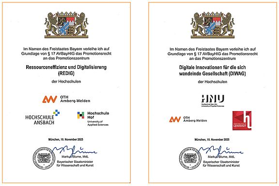 Die OTH Amberg-Weiden hat im September 2023 einen weiteren Meilenstein ihrer Entwicklung erreicht: Der Bayerische Staatsminister für Wissenschaft und Kunst, Markus Blume, vergab an die Hochschule das Promotionsrecht für zwei Forschungsschwerpunkte. Mit dieser für die Hochschule wegweisenden Befürwortung der Antragstellungen hat die OTH Amberg-Weiden nun die Befugnis, in eigener Verantwortung Promotionsverfahren durchzuführen und herausragende Absolvierende auf den Weg zum Doktortitel zu führen.