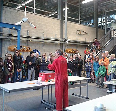 Luft ist nicht nur zum Atmen da. Das wissen die zahlreichen Besucher der 3. Amberger Luftnacht spätestens seit den Vorführungen an der OTH Amberg. Prof. Dr.-Ing. Andreas P. Weiß, Laboringenieur Dipl.-Ing. Harald Wirth und B. Eng. Tim Rembold (alle Fakultät Maschinenbau/Umwelttechnik) veranschaulichten in Experimenten einige der wichtigsten Gesetzmäßigkeiten der Strömungsmechanik und Aerodynamik. Unter dem Motto „Luftphysik - Luftsingen, Luftzaubern, Luftdrücken“ demonstrierten sie, wie Ingenieure die Luft verstehen und was sie mit ihr alles machen können.