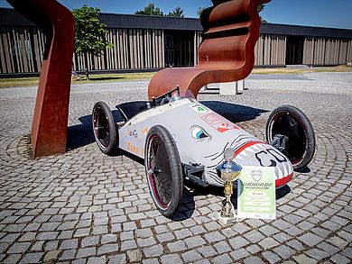 Sicher war der Sieg nicht. Denn beim letzten Wettbewerb holte sich das Team der OTH Amberg-Weiden gerade Platz 11. Das entfachte den Ehrgeiz der Ingenieurinnen und Ingenieure der Fakultät Wirtschaftsingenieurwesen. Deshalb jagten sie den Boliden durch den virtuellen Strömungskanal: Mit einer Strömungssimulation auf dem Computer berechneten sie den Reibungswiderstand und optimierten die Seifenkiste. Verdienter Lohn: der erste Platz und 400 Euro Preisgeld.
