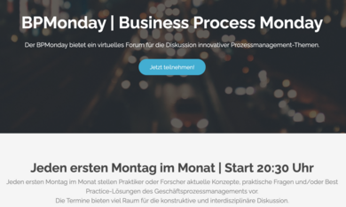 Der BPMonday bietet ein virtuelles Forum für die Diskussion innovativer Prozessmanagement-Themen. Ab Mai 2021 stellt an jedem ersten Montag im Monat ein Praktiker oder Forscher aktuelle Konzepte, praktische Fragen und/oder Best Practice-Lösungen des Geschäftsprozessmanagements vor. Start der Reihe ist am Montag, 03.05.21 um 20.30 Uhr. Teilnehmen können alle Interessierten über die Seite www.BPMonday.de .