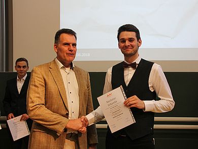 Nach der Übergabe der Bachelorurkunden, erhielten Stefan Brückner und Sandra Lindner eine zusätzliche Auszeichnung für ihr besonderes soziales Engagement außerhalb des Studienbetriebes ausgehändigt.
