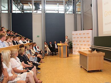 Die Verabschiedung der Master wurde von einer Rede des Absolventen M.Eng. Gregor Lachs eröffnet. Seine Position am Rednerpult genoss er sichtlich und erklärte auch warum: „Ich wollte schon immer mal hier stehen und sagen: Die Vorlesung endet, wenn ich es sage.“ Die Lacher hatte er damit sofort auf seiner Seite. Aber auch weitere Anekdoten aus seinem Studentenleben sorgten für viele Schmunzler. So berichtete der Masterabsolvent aus Schwäbisch Hall von den dialekttechnischen Herausforderungen in der Oberpfalz. Oder vom „Exzerpieren“, dem Lieblingswort Professor Tiefels, bei dessen erstmaliger Deutung Gregor Lachs auch seine vier Jahre Latein wenig geholfen haben. Ganz besonders hob er die gute Gemeinschaft der Kommilitonen hervor: „Wir haben zusammen gelernt, Prüfungen geschrieben, Praktika absolviert und uns aufs Leben vorbereitet – zum Beispiel am späten Abend in den EDV-Laboren – beim Spielen von Age of Empires – ich kann Ihnen sagen, das bereitet einen aufs Leben vor“.