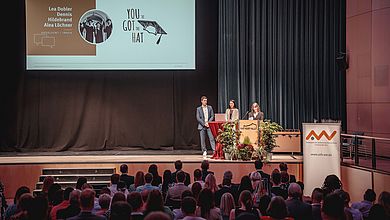Ein besonderes Highlight war die mitreißende Rede der drei Absolvent*innen Alea Löchner, Dennis Hildebrand und Lea Dobler. Sie ließen ihre Studienzeit sehr lebhaft Revue passieren und brachten die Zuschauenden zum Schmunzeln. So erzählte Dennis Hildebrand: „Ich erinnere mich an eine Zeit zurück noch vor der Erfindung von ChatGPT. Eine Zeit, in der die Pandemie uns zwar physisch trennte, aber unsere Entschlossenheit nicht brechen konnte. Als wir bewaffnet mit unseren Jogginghosen vor den Laptops saßen und gespannt darauf warteten, dass die Professoren den virtuellen „Big Blue Button“ Raum betraten.“