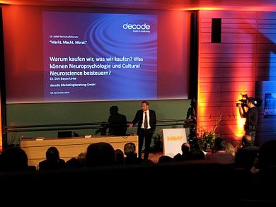 Der zweite Referent, Dr. Dirk Bayas-Linke, widmete sich dem in der Neuropsychologie hochaktuellen Thema „Codes - Warum kaufen wir, was wir kaufen? – Was können Neuropsychologie und Cultural Neuroscience beisteuern?“ Durch seinen mit vielen Praxisbeispielen illustrierten Vortrag brachte er dem Publikum das Kaufentscheidungsverhalten der Menschen anschaulich näher. Die Produktentscheidungen der Konsumenten werden bei ihren täglichen Einkäufen implizit getroffen. Die physische Wahrnehmung der Produkte durch die Sinne verknüpfe sich unmittelbar mit der psychischen Verarbeitung im Gehirn. Bayas-Linke stellt aus neuropsychologischer Sicht dar, wie das Gehirn Elemente von Werbebotschaften wahrnimmt und wie diese im Einklang mit den impliziten Zielen der Kunden stehen müssen, um erfolgreich zu wir-ken.