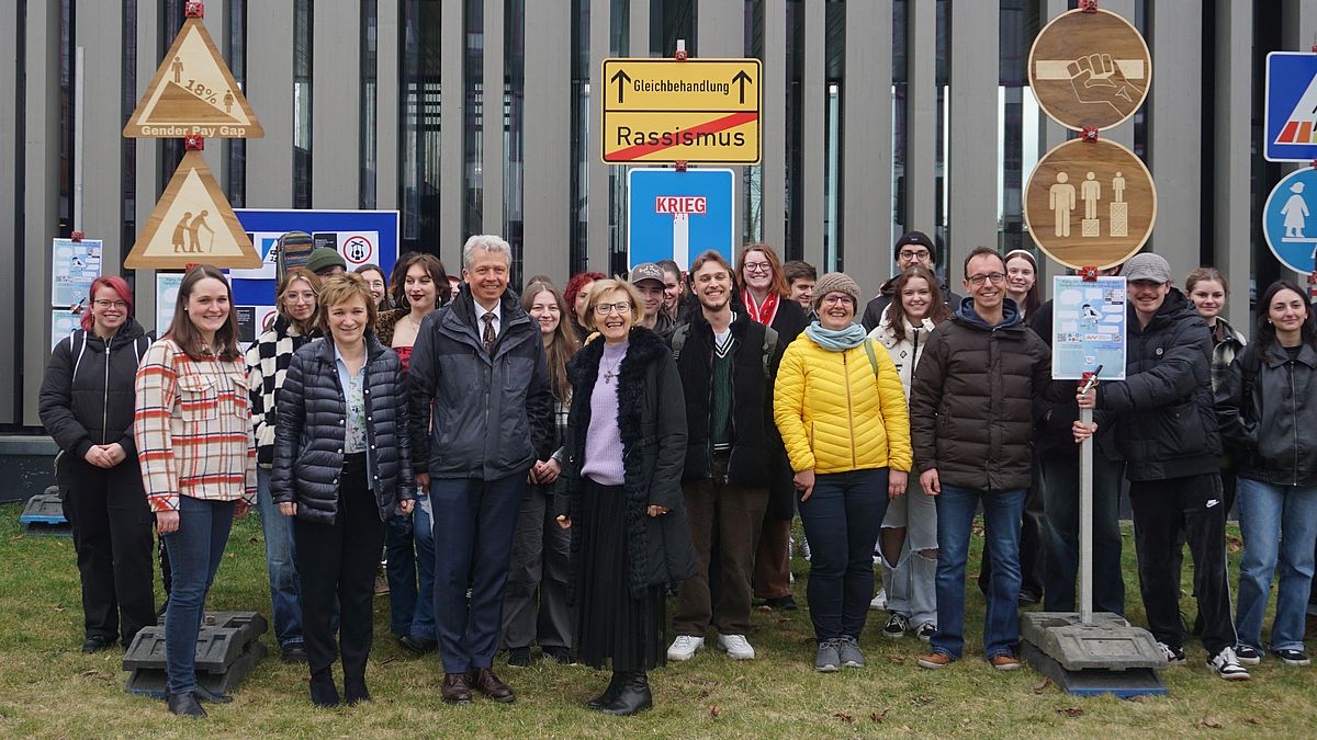 Auf dem Campus der Hochschule wurden nun sowohl die ursprünglichen Verkehrsschilder der Gerechtigkeit als auch die Werke der Schülerinnen und Schüler der FOSBOS ausgestellt. Bei der Eröffnung der Ausstellung zeigten sich sowohl Hochschulpräsident Prof. Dr. Clemens Bulitta als auch Schulleiterin Gabriele Dill begeistert von der Kreativität der Schüler*innen, die mit ihren Werken wichtige Denkanstöße gerade in der heutigen Zeit liefern.