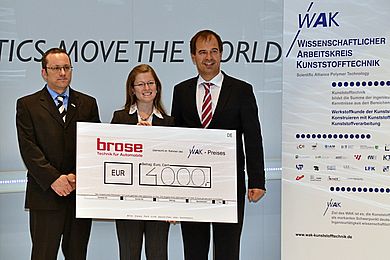 Der Wissenschaftliche Arbeitskreis Kunststofftechnik (WAK) verleiht jedes Jahr drei Preise, so auch den Brose-Preis. In ihrer Masterarbeit am Lehrstuhl für Kunststofftechnik (LKT) der Friedrich-Alexander-Universität Erlangen-Nürnberg, betreut von Prof. Dr.-Ing. Dietmar Drummer, untersuchte Frau M. Sc. Manuela Weiß den Einfluss von variothermer Temperierung auf die Eigenschaften von Mikrospritzgussteilen. Charakteristisch für den Dünnwand- und Mikrospritzguss ist eine sehr hohe Abkühlgeschwindigkeit auf Grund des großen Oberflächen-Volumen-Verhältnisses von sehr kleinen und dünnen Bauteilen. So stellte Frau Weiß zunächst den variothermen Prozess und verschiedene konstant temperierte Prozesse per Simulation dar, um Ausgangsbedingungen für den realen Spritzgießprozess zu bekommen. Die Ergebnisse der Arbeit von Frau Weiß zeigten, dass durch die variotherme Temperierung Bauteileigenschaften erzielt werden können, die mit einer konstanten Temperierung auf 120° Celsius vergleichbar sind.