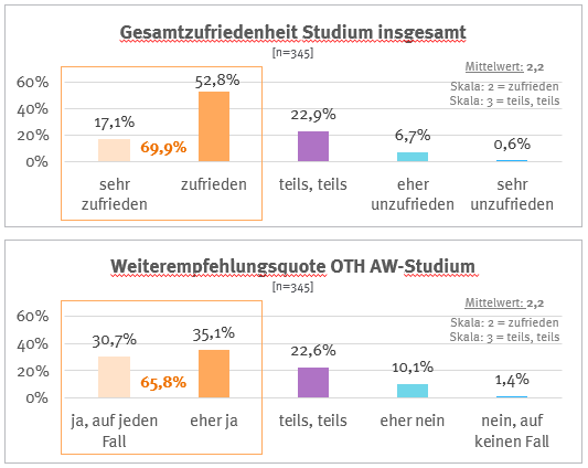 70 Prozent der Bachelorstudierenden zeigen sich - trotz signifikanter Einschränkungen aufgrund der Corona-Pandemie - mit ihrem Studium an der OTH Amberg-Weiden (sehr) zufrieden. 66 Prozent würden ihrem Freundeskreis ein Studium an der Hochschule empfehlen. Gründe dafür sind insbesondere die familiäre Atmosphäre, der hohe Praxis- und Anwendungsbezug sowie die engagierten Dozierenden. Dies sind die Ergebnisse der Bachelorstudierendenbefragung, die im Sommersemester 2023 stattfand.