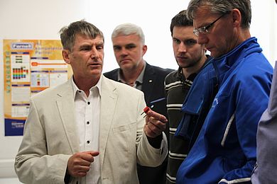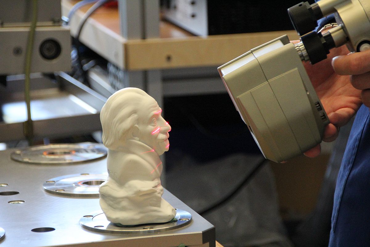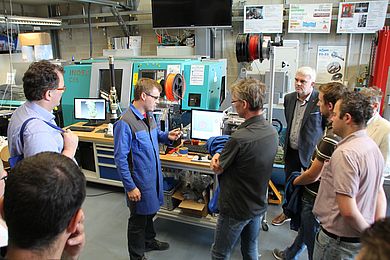 Die nächste Station war das Werkzeugmaschinenlabor der Fakultät Maschinenbau/Umwelttechnik. Hier erklärte Dipl.-Ing. (FH) Daniel Weiß den Techniktrend 3D-Druck anhand der Prozesskette der additiven Fertigung: mit Hilfe des Laserscanners Objekt digitalisieren, im CAD verarbeiten, skalieren und anschließend verkleinert auf dem 3D-Drucker drucken.