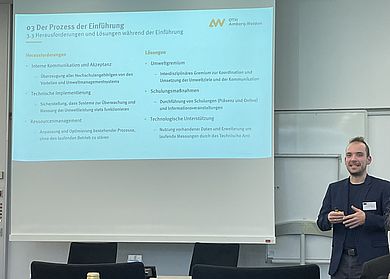 Das Institut für Nachhaltigkeit und Ethik der OTH Amberg-Weiden war bei der Tagung mit zwei Programmpunkten vertreten. Am Vormittag stellten Prof. Dr. Christiane Hellbach, Vizepräsidentin für Nachhaltigkeit, und Christoph Brechler, Umweltmanager, das Umweltmanagementsystem der Hochschule vor. Hier nimmt die OTH Amberg-Weiden eine Vorreiterrolle ein, denn als eine der ersten Hochschulen deutschlandweit führte sie 2022 ein Umweltmanagementsystem gemäß der international gültigen ISO-Norm 14001 ein.