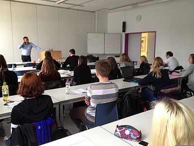 Nach einem anfänglichen Impulsvortrag mit vielen Praxisbeispielen von Dr. Horvath mussten die Studierenden in wechselnden Gruppen Fragen zur Strategie und Umsetzung eines eigenen Projektes beantworten und im Anschluss dieses Projekt in einer Präsentation auszarbeiten und dem Plenum vorstellen. So konnten die TeilnehmerInnen sowohl ihre Englischkenntnisse aufbessern, ihre Kommilitonen kennenlernen und coachen und sich fachlich weiterbilden.