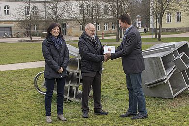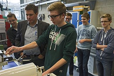 Nach Unterzeichnung der Kooperationsvereinbarung zwischen dem Erasmus Gymnasium Amberg und der OTH Amberg-Weiden im Frühjahr des Jahres wurde dem Schulleiter OStD Peter Seidl eine Glasplatte überreicht, die das Gymnasium nun ganz offiziell als Kooperationsschule der Hochschule ausweist. Der heutige Besuch unterstreicht, dass die Kooperation auch tatsächlich mit Leben gefüllt wird.