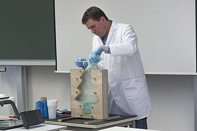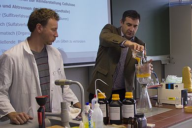 In den anschließenden Laborbesichtigungen erläuterte Prof. Dr.-Ing. Werner Prell den SchülerInnen die Herstellung von Biopolymeren am Beispiel des Celluloseacetats. Hier wurde die gesamte Prozesskette ausgehend von der Cellulose bis hin zum Celluloseacetat in vorbereiteten Versuchen nachgestellt und anschaulich erklärt.