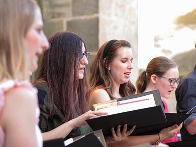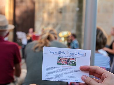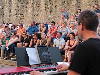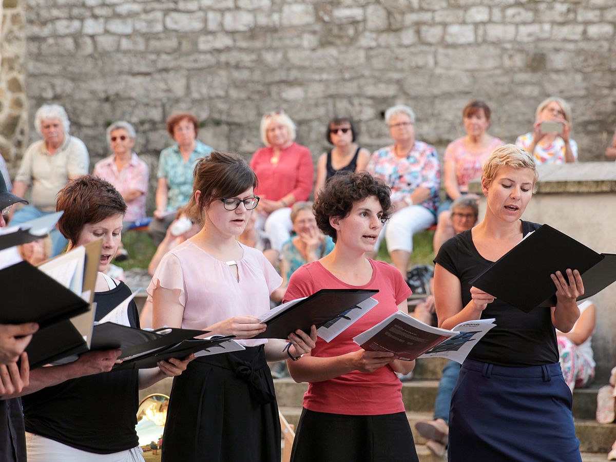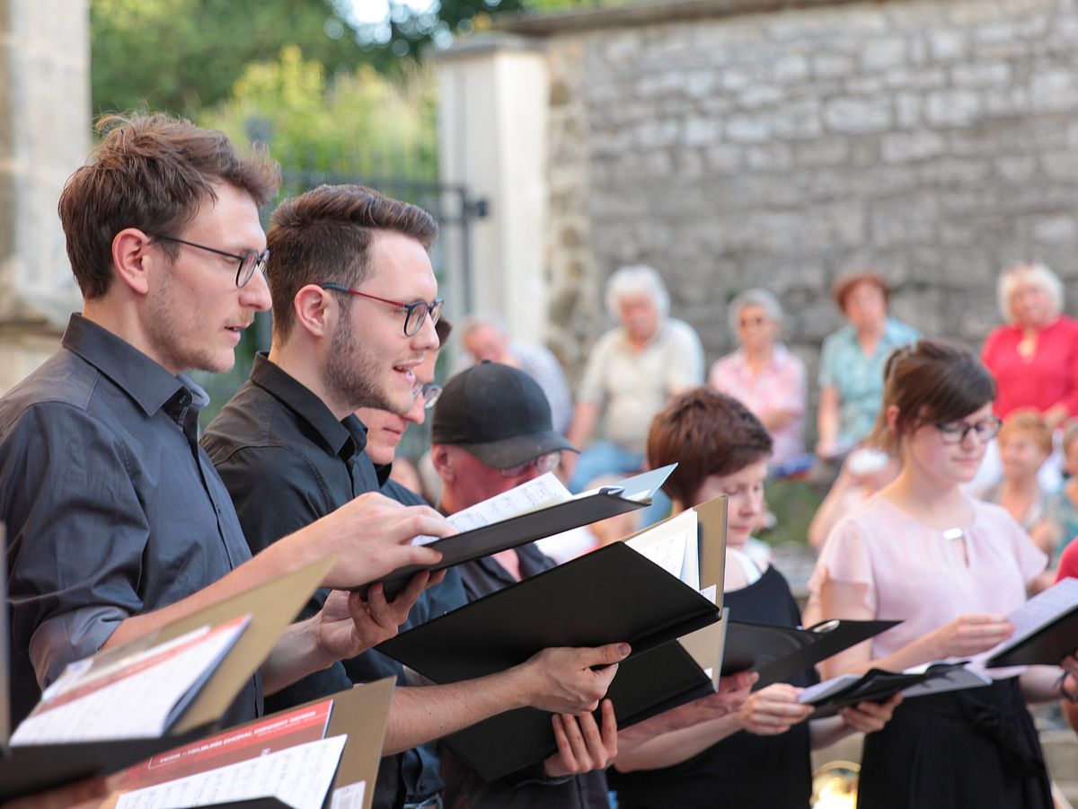 Man fühlt sich fast nach Italien versetzt beim exklusiven Musikabend vor dem Vorplatz des Kirchturms von St. Georg. Der Hochschulchor, der gemeinsam mit dem CVJM-Posaunenchor Rosenberg Musik rund um das Leben, die Liebe und die Freude, zum Besten gab, lockte zahlreiche BesucherInnen an.