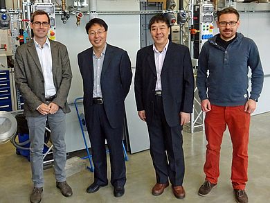 Prof. Dr. Markus Brautsch begrüßte die chinesischen Gäste Prof. Sun Ping und Prof. Wang Zhong an der OTH Amberg-Weiden. Anschließend besichtigten sie mit Raphael Lechner und Andreas Röll (beide KoKWK) die Labore der Fakultät Maschinenbau/Umwelttechnik und das neue KWK-Technikum. Hier konnten die Besucher aus China auch praktisch tätig werden und Effizienzmessungen an einem Gas-Otto-BHKW durchführen.