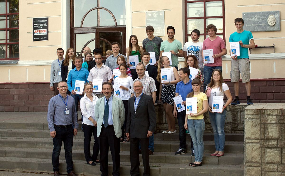 Entsprechend waren technische und kaufmännische Fragestellungen jeweils in Projektteams zu bearbeiten. Die Teilnehmer(innen) waren deshalb aus allen Fakultäten der OTH Amberg-Weiden zusammengesetzt. Auf russischer Seite waren weitgehend Techniker und Architekten einbezogen. Eine weitere Herausforderung für die 4 interkulturell und interdisziplinär zusammengesetzten Teams war die Kommunikation und die Verständigung auf die am besten geeigneten Lösungen für die Aufgaben. Den Studierenden aus Amberg und Weiden wurde hierfür in einem Vorkurs, unterstützt durch das Zentrum für Sprachen und Mittel-Osteuropa der OTH Amberg-Weiden, Grundlegendes zur russischen Sprache vermittelt. Am Beispiel des Neubaus einer mehrgeschossigen Wohnanlage sowie einer modernen Heizzentrale lernten die Teilnehmer(innen), Daten zu erfassen, auszuwerten und zu bewerten. Insbesondere, um die drei technischen Optionen Heizkraftwerk, Kraftwerk mit Heizzentrale sowie Blockheizkraftwerk über die CO2-Emissionen sowie die Energiegestehungskosten zu bewerten. Einvernehmlich hatte die Technologie Blockheizkraftwerke, derzeit in Russland noch nicht stark im Einsatz, mit deutlichem Vorsprung Vorteile gegenüber den anderen Varianten. Beim kulturellen Rahmenprogramm standen die Geschichte und kulturelle Besonderheiten im Vordergrund. Der Abschied in Form eines russischer Abends mit typischen Spezialitäten war eine gute Gelegenheit, Verabredungen für die Zeit nach der Summer University zu treffen, auch mit Blick auf die im September 2015 in Weiden geplante Veranstaltung mit den Universitäten in Tambov und Krasnojarsk. Das Foto zeigt die Gruppe bei der Verleihung der Teilnahmezertifikate. Erste Reihe von links: Jegor Kern, Vize-Rektorin Prof. Dr. Elena Mishhenko, Rektor Prof. Dr. Michail Krasnjanskij (Tambov Staatliche Technische Universität), Prof. Dr. Magnus Jaeger (OTH Amberg-Weiden).