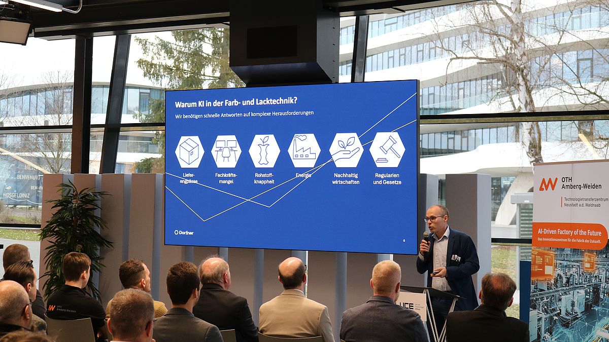 Zum Auftakt begrüßte Prof. Dr. Wolfgang Weber, Vizepräsident der OTH Amberg-Weiden, die Gäste. Prof. Dr. Kris Dalm und Dr. Stephan Roth gaben anschließend Einblicke in die Arbeit und Zielsetzung des TTZ NEW, das Unternehmen der Region dabei unterstützt, Digitalisierung und Künstliche Intelligenz praxistauglich in Produktionsprozesse zu integrieren.