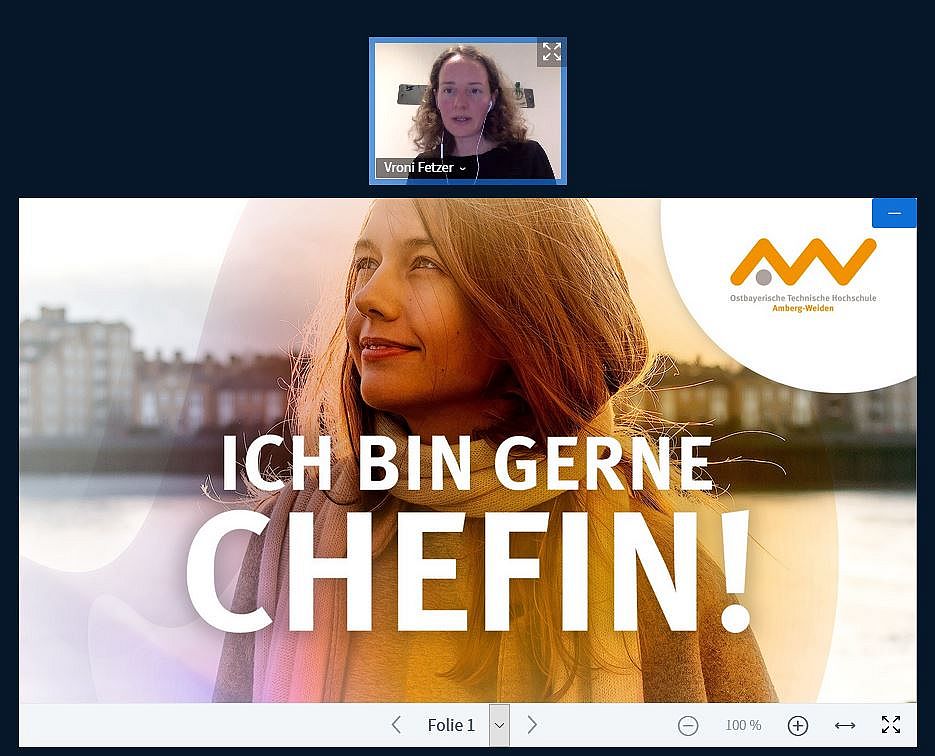 Bei „Ich bin gerne Chefin! Gründerinnen und Entscheiderinnen in der (Nord-)Oberpfalz“ referierte sie nicht nur über ihr Führungsprinzip „Prima inter Pares: Als Chefin Erste unter Gleichen“, sondern erzählte auch über ihren eigenen Weg bis zur Projektleitung bei einem der erfolgreichsten digitalen Gründerzentren Bayerns.