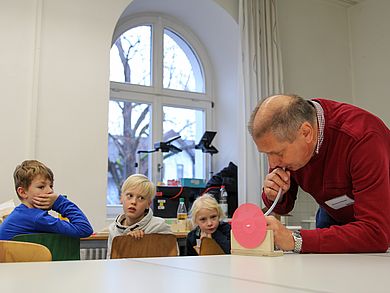 Alles, was wir hören, ist Schall. Die physikalischen Grundlagen erklärte Akustik-Experte Jürgen Schafberger vom Labor für Akustik und Schallanalyse (LAuS) den Kindern einfach und verständlich. Anhand praktischer Beispiele zeigte Jürgen Schafberger, was Schall bzw. Schallwellen bewirken können. In einem eindrucksvollen Versuch demonstrierte er, dass man mit Schallwellen sogar Glas zerstören kann.