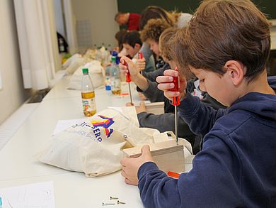 Nach der Kindervorlesung ging’s an die technische Bastelei. Unter Anleitung von Manfred Bauer und mit Unterstützung von Studierenden der OTH Amberg-Weiden und Auszubildenden der Stadtwerke bauten die Kinder ein „Schallerzeugungs-Gerät“, eine sogenannte Lochsirene.