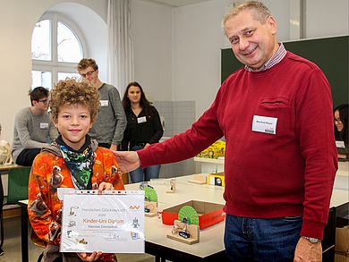 Zum Abschluss des Vormittagsprogramm wurde Hannes Demleitner das Kinder-Uni-Diplom überreicht. Der Schüler hat regelmäßig an den Kinderveranstaltungen der OTH Amberg-Weiden teilgenommen und fleißig Stempel gesammelt.