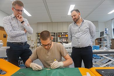 „Was die Studierenden hier lernen, können sie später eins zu eins in ihrem Berufsalltag umsetzen. Sie lernen hier nicht nur die medizinische Theorie, sondern auch die praktische Anwendung”, erklärt Prof. Dr. med. habil. Christian Schmidkonz, der gemeinsam mit Prof. Dr. med. Matthias Feyrer und Laboringenieur Felix Wittmann die Prüfung abnahm. Wichtig ist den Prüfern, dass die Studierenden noch während der Prüfung Feedback bekommen, ihre Stärken und Schwächen erkennen und gezielt an ihren klinischen Fähigkeiten weiterarbeiten können. „Jedes Szenario ist ein bisschen anders. Das bedeutet, dass man bei jeder praktischen Übung dazu lernt und sein Verständnis vertieft. Das ist das Schöne und Einzigartige an dieser Prüfungsform”, so Schmidkonz.
