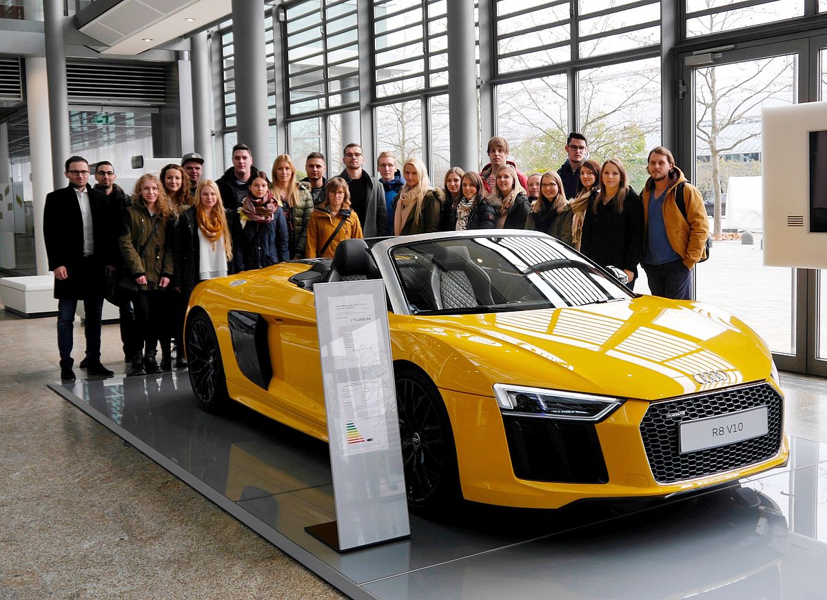 Nach der Begrüßung im Audi-Hauptwerk in Ingolstadt, in dem – wie die Studierenden lernten – ca. 45.000 Mitarbeiter beschäftigt sind und das flächenmäßig größer als der Staat Monaco ist, folgte ein Fachvortrag von Ralph Ilsanker zum Thema „Von der Kommunikationsstrategie zur Umsetzung“. Dabei zeigte der Marketing-Manager auf, wie typische Kommunikationsprozesse von der ersten Idee eines neuen Fahrzeugs bis zur Auslieferung ablaufen, welche Kanäle in verschiedenen Phasen integriert werden und wie auf Kundenbedürfnisse reagiert wird.
