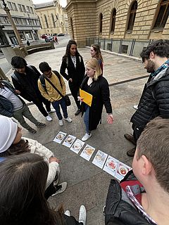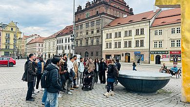 Nach diesem Einblick in das studentische Leben ging es weiter ins Stadtzentrum. Hier übernahmen zwei Mitarbeiterinnen des Projekts "Erlebe Pilsen!" im wahrsten Sinne des Wortes die Führung. Bei einem interaktiven Stadtrundgang erfuhren die Studierenden nicht nur Wissenswertes über die Geschichte der Stadt, sondern lernten auf unterhaltsame Art und Weise die tschechische Sprache kennen. Außerdem erhielten sie Tipps, wo sie das beste Bier und die schönsten Cafés finden. Mit diesen Informationen im Gepäck machten sich die Teilnehmenden auf, um die Stadt auf eigene Faust zu entdecken und vielleicht auch das ein oder andere neu gelernte tschechische Wort anzuwenden.