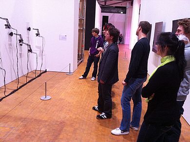 In der Sonderschau konnten ungewöhnliche Klanginstallationen unterschiedlicher Künstler erlebt werden. Klangcollagen, Klangskulpturen (unter anderem von Nam June Paik und Joseph Beuys) sowie spezielle, zum Teil interaktiv gestaltete Hörräume machten auf die besonderen Eigenheiten und Eigenschaften unseres Hörsinns aufmerksam. Abgerundet wurde die Ausstellung durch eine Retrospektive über das Schaffen des Schweizer Künstlers Dieter Meier. Dieter Meier wurde in den Achtzigern und Neunzigern des letzten Jahrhunderts zusammen mit seinem Partner Boris Blank mit dem Pop-Duo „Yello“ der Allgemeinheit sehr bekannt. Das Foto zeigt einen Teil der Studierenden zusammen mit Prof. Dr. Meiller beim Betrachten der Klanginstallation „Equilibrium“ von Roberto Pugliese: Hier wird versucht, eine sich im Normalfall aufschaukelnde Tonrückkopplung mit Hilfe durch Mikrofon-bestückte, servogesteuerte Metallarme im Pegel konstant zu halten. Die Metallarme mit ihren Mikrofonen verändern ständig die Position vor dem Lautsprecher und damit den einfallenden aufgenommenen Tonpegel.