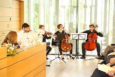 Dennoch durften sich die Betriebswirtinnen und -wirte im Hörsaal 1 sowie die Handels- und Dienstleistungsmanagerinnen und -manager im Hörsaal 2 über ein Live-Programm freuen – denn die Veranstaltungen begannen zeitversetzt. Auf diese Weise konnte Dekan Prof. Dr. Wolfgang Renninger die Absolventenverabschiedung in beiden Hörsälen eröffnen. Auch der Pianist und ehemalige OTH-Student Florian Christl wechselte zwischen seinen Auftritten den Ort – so begeisterte er mit seinem Streicher-Ensemble die Zuhörer beider Studiengänge.