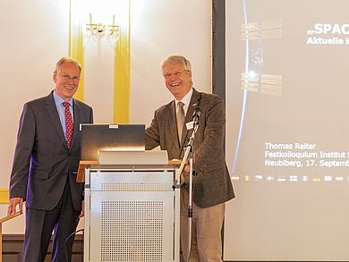Promimentester Gastredner beim Festkolloquium war sicherlich Birgadegeneral a. D., Dr. h.c., Dipl.-Ing. Thomas Reiter. Herr Reiter hatte 1982 als einer der ersten bei Prof. Fottner am ISA diplomiert. Sein Werdegang als Offizier bei der Luftwaffe führte zunächst zum Einsatzpiloten auf den Mustern AlphaJet und Tornado und dann zu einer Testpiloten-Ausbildung. 1992 begann seine Ausbildung zum ESA-Astronauten (European Space Agency). 1995/96 arbeitete er 179 Tage als Wissenschaftsastronaut auf der russischen Raumstation MIR, 2006 171 Tage auf der ISS. 2007-2011 war er im Vorstand des Deutschen Zentrums für Luft- und Raumfahrt (DLR), 2011-2015 dann als Leiter des ESA-Direktorats „Bemannte Raumfahrt“ tätig.