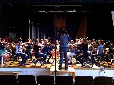 Mit dem mobilen Tonequipment aus dem Multimedialabor konnten die Studierenden die Musikproduktion im akustischen Umfeld des Orchesters im Festsaal des Gymnasiums aufnehmen. Betreut wurde das Projekt von Prof. Dipl.-Ing. Maximilian Kock (Fakultät Elektro- und Informationstechnik).